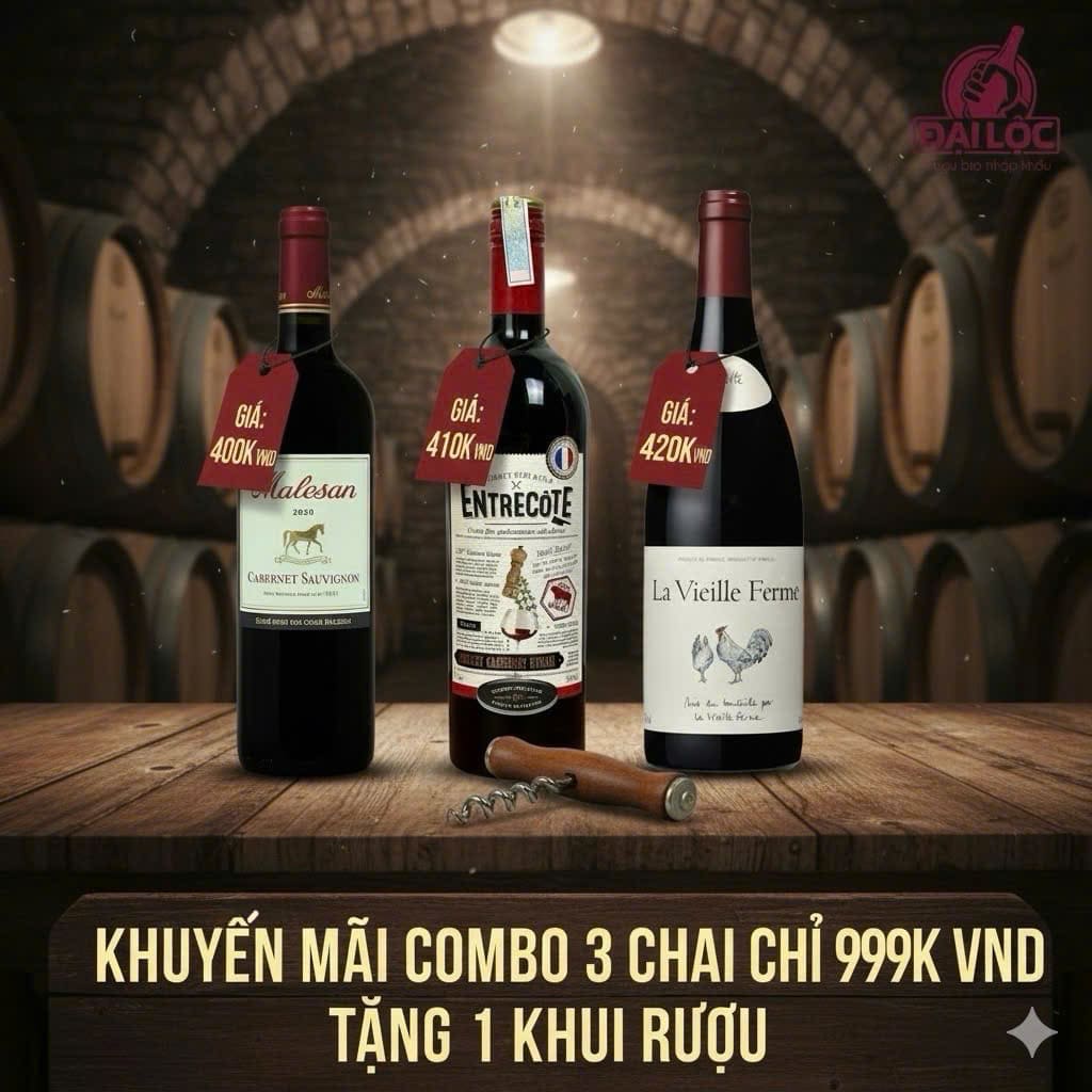 Combo 3 Chai Vang Pháp giá 999K VND (Malesan, Entrecôte, La Vieille Ferme) là một ưu đãi đặc biệt không thể bỏ lỡ. Hãy đặt mua ngay hôm nay để sở hữu bộ sưu tập vang đỏ Pháp chất lượng với mức giá tốt nhất thị trường!