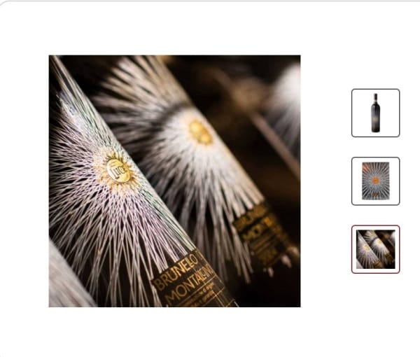 Hình ảnh “ mặt trời của Luce ” trên chai Luce Brunello Di Montalcino vàng. Mặt trời 12 tia lửa màu vàng là trung tâm. Tỏa ra vầng hào quang rộng lớn màu trắng bao phủ khắp thân chai rượu. Hình ảnh được in phun trực tiếp trên chai. Nhãn Brunello Di Montalcino được dán phần cuối thân chai.